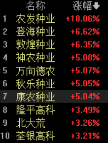 早盘,A股农业种植(核心股)板块异军突起,领涨股农发种业涨停涨10.06%,登海种业、神农种业、敦煌种业、万向德农、秋乐种业、康农种业涨超5%,隆平高科、北大荒、荃银高科涨超3%。