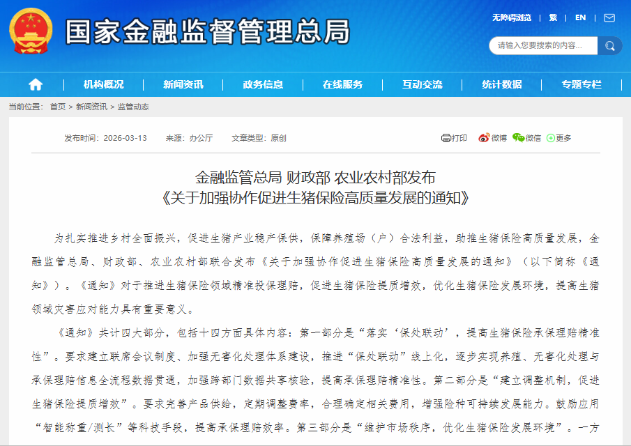 3月13日,据金融监管总局网站,金融监管总局、财政部、农业农村部联合发布《关于加强协作促进生猪保险高质量发展的通知》。其中提到,落实“保处联动”,提高生猪保险承保理赔精准性。要求建立联席会议制度、加强无害化处理体系建设,推进“保处联动”线上化,逐步实现养殖、无害化处理与承保理赔信息全流程数据贯通,加强跨部门数据共享核验,提高承保理赔精准性。建立调整机制,促进生猪保险提质增效。要求完善产品供给,定期调整费率,合理确定相关费用,增强险种可持续发展能力。鼓励应用“智能称重/测长”等科技手段,提高承保理赔效率。