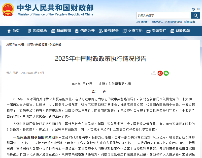 3月17日,据财政部网站,财政部发布2025年中国财政政策执行情况报告。其中提到,促进农业保险扩面增效。坚持高保障、广覆盖、多元化,持续支持三大主粮、大豆等重要农产品保险发展,在全国范围继续实施地方优势特色农产品保险奖补政策。指导地方和承保机构加强精细化管理,提高承保理赔、查勘定损等服务质效。在西藏定日地震、台风“桦加沙”等灾害发生后,农业保险政策在减轻农户因灾损失方面发挥了重要作用。2025年,中央财政拨付农业保险保费补贴517亿元,支持我国农业保险保费规模超1550亿元、为1.25亿户次农户提供风险保障超5万亿元、向农户支付赔款超1200亿元。
