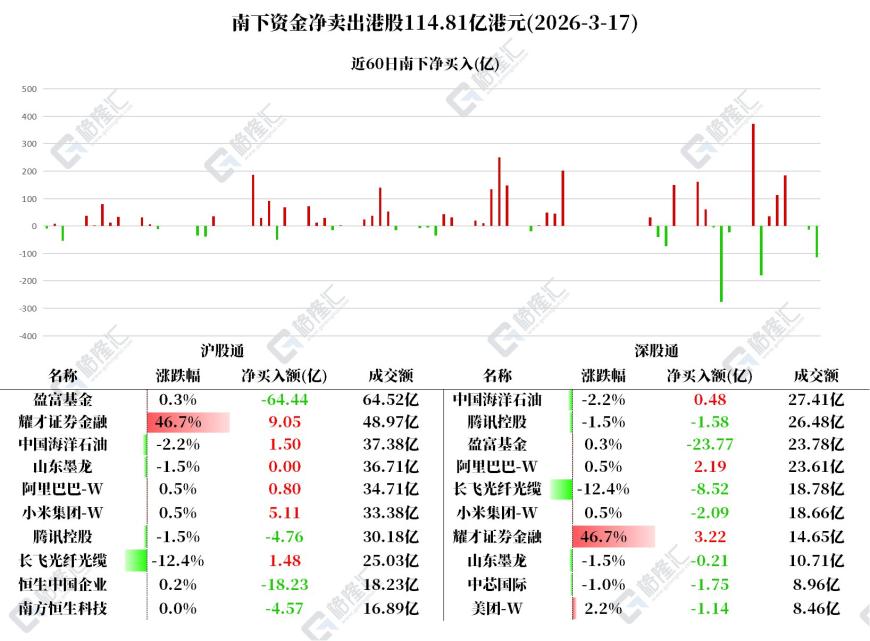 南下资金今日(3月17日)净卖出港股114.81亿港元。其中:净买入耀才证券金融12.27亿、华虹半导体3.87亿、小米集团-W 3.01亿、阿里巴巴-W 2.98亿、中国海洋石油1.97亿;净卖出盈富基金88.21亿、恒生中国企业18.23亿、长飞光纤光缆7.04亿、腾讯控股6.33亿、南方恒生科技4.57亿、中芯国际1.75亿、美团-W 1.14亿。据统计,南下资金连续5日净买入中海油,共计35.8185亿港元;连续3日净买入阿里,共计12.9924亿港元。
