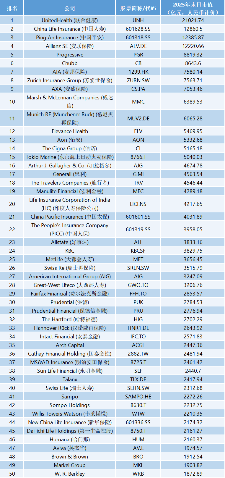 具体看来,联合健康以21021.74亿元的总市值排名第一,中国人寿以12860.5亿元市值排名第二,另外市值达到12385.87亿元的中国平安位列第三,安联保险以12220.66亿元排名第四,前进保险(Progressive)以8819.32亿元排名第五,安达集团(Chubb)以8643.6亿元排名第六,友邦保险以市值7580.14亿元位列第七,苏黎世保险以7563.71亿元排名第八,安盛保险以7053.46亿元位列第九,威达信则是以6389.53亿元排名第十。