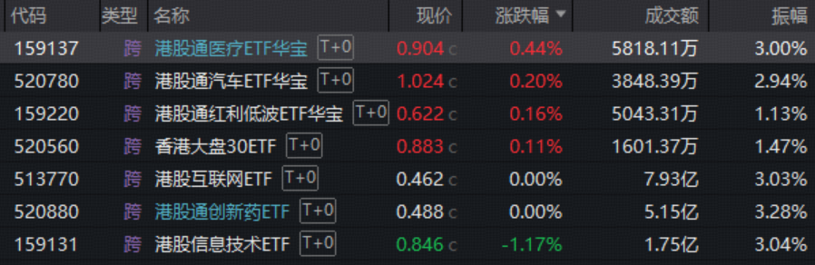 医药板块亦陷震荡,港股医疗核心资产——港股通医疗ETF华宝(159137)早盘一度摸高3.38%,最终小幅收涨0.44%,100%创新药研发——港股通创新药ETF(520880)放量收平。