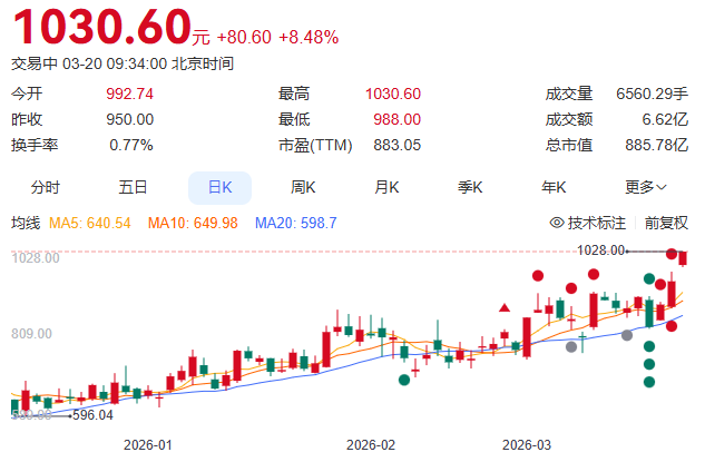 正文 史上第八只千元股诞生!源杰科技股价1年涨近6.9倍 三木 V管理员 /03-20 /0 评论 /6 阅读 0320 文章最后更新时间2026年03月20日,若文章内容或图片失效,请留言反馈! 3月20日,CPO概念(核心股)人气股源杰科技股价触及1000元,续创历史新高,成为A股历史上第8只千元股。若以2025年3月20日收盘价计算,该股最近1年累计涨幅近690%。 在A股历史中,累计共有7股曾经或目前股价在1000元以上,分别为中安科、贵州茅台、云赛智联、寒武纪、石头科技、禾迈股份、爱美客。其中,贵州茅台、石头科技、爱美客3股均于2021年达到历史最高价,而禾迈股份、寒武纪则分别于2022年、2025年股价创历史新高。 股票频道更多独家策划、专家专栏,免费查阅>>
