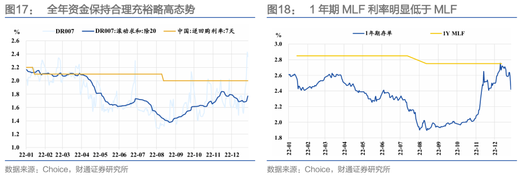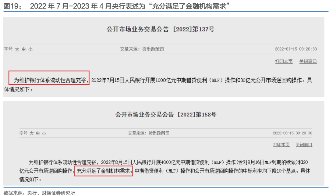 值得注意的是,自2022年8月起,央行在MLF操作公告中开始持续使用“充分满足了金融机构需求”这一表述,直至2023年4月,进一步说明期间缩量可能有金融机构主动报量收敛所致。