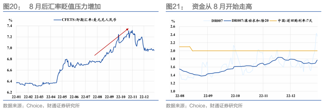 另外一方面央行可能有内外部均衡的考虑。2022年8月在“联储加息预期升温+国内基本面疲软+中美或政策分化”背景下,人民币进入贬值通道,9月16日在岸人民币即期汇率突破7.0关键点位,并在央行采取多种逆周期调控措施的背景下继续贬值,随后结合8月中下旬票据利率回升、稳增长力度提升,资金利率在8月中下旬出现明显上行。