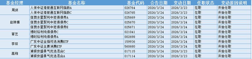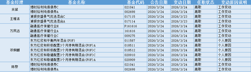 基金经理是一只基金产品最核心的成员,能决定一只基金的投资方向、投资策略以及投资风格,基金经理出色的择时选股能力和调研预测能力是基金业绩的有力保证,所以基金经理是投资者在选择基金产品时的重要依据。基金经理的变动很大程度上会影响到基金产品未来的表现,是一个需要特别关注的信息。3.24日共有10位基金经理发生任职变动。