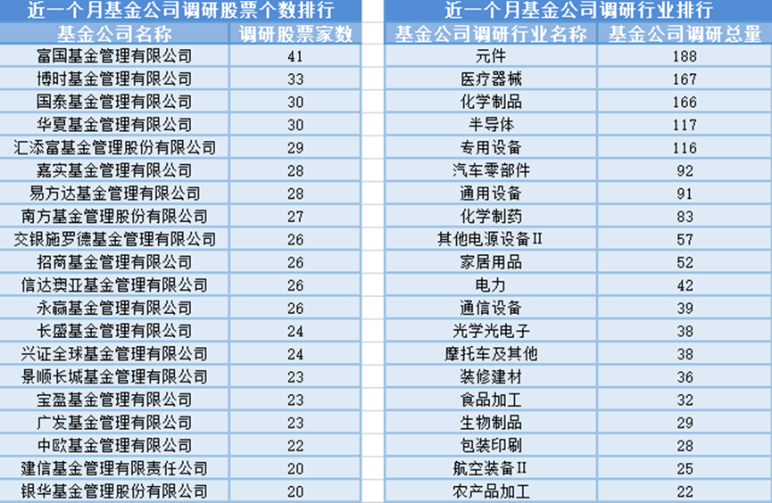 近一个月(2月22日-3月24日),富国基金参与公司调研的数量最多,共调研41家上市公司,此外调研较为活跃的还有博时基金、国泰基金和华夏基金,分别调研33家、30家、30家上市公司;从调研行业上来看,基金公司对元件行业的上市公司调研次数最多,共有188次,其次是医疗器械行业,基金公司调研了167次。