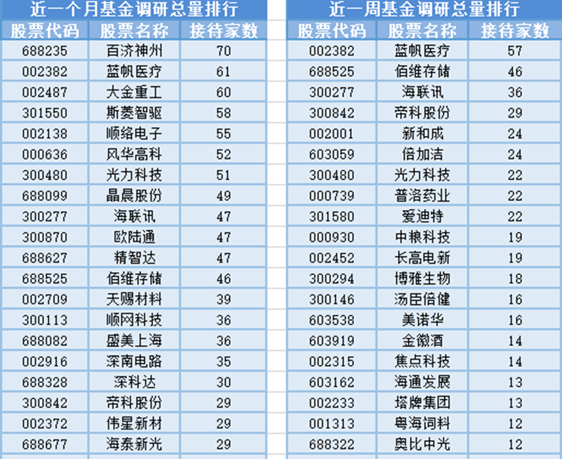 从个股调研情况上来看,最近1个月(2月22日-3月24日)最受公募基金关注的是百济神州,百济神州属于化学制药行业,主营业务为研究、开发、生产以及商业化创新型药物。共有70家基金管理公司参与调研,其次是蓝帆医疗和大金重工,分别接受61家、60家基金管理公司的调研。