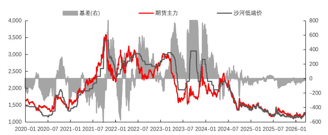 图为纯碱期货主力合约价格及基差走势(单位:元/吨)