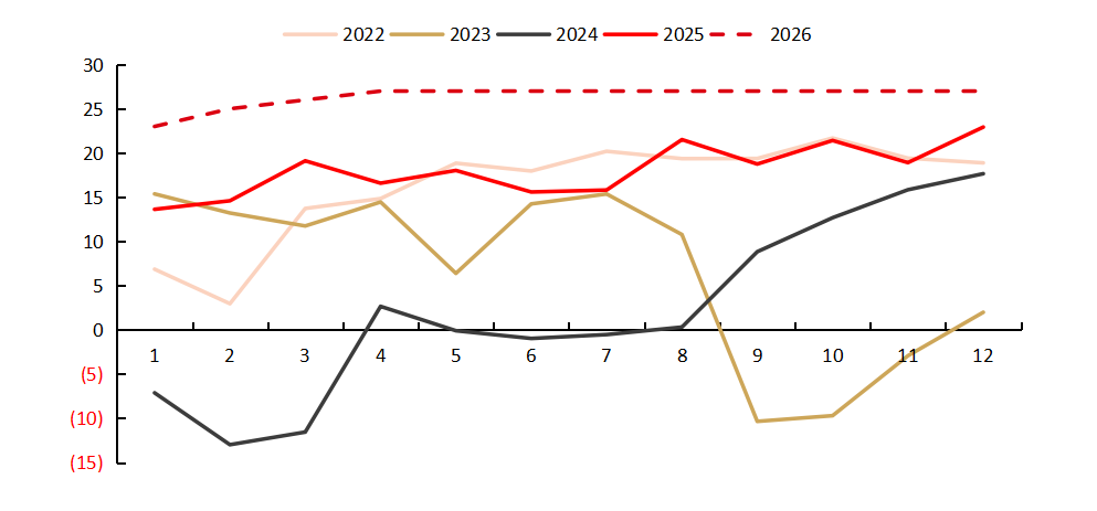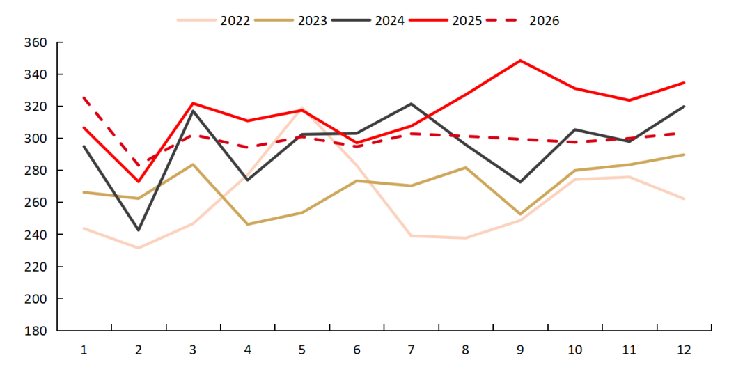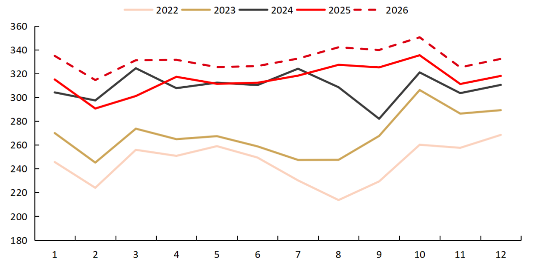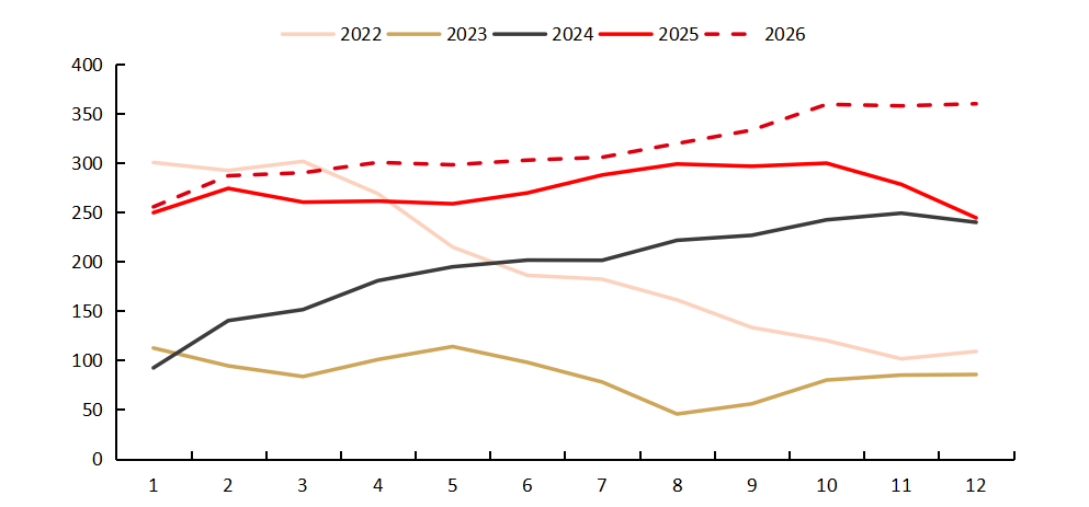 考虑到新增产能和夏季检修,预计纯碱月度产量维持在332万吨左右的高位,2026年全年纯碱产量增幅在5.4%左右,总产量提升200万吨,从而进一步加深纯碱供应过剩的局面。