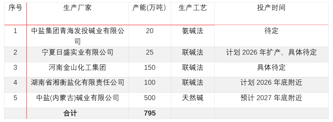 从目前光伏玻璃投产计划来看,新建和复产的产线均具备一定点火条件,后期可能择机投产,但光伏玻璃供应过剩仍难以扭转,预计对重碱需求的拉动作用下降。2026年,浮法玻璃和光伏玻璃仍难以扭转供需弱势的局面,对重碱需求形成一定拖累。