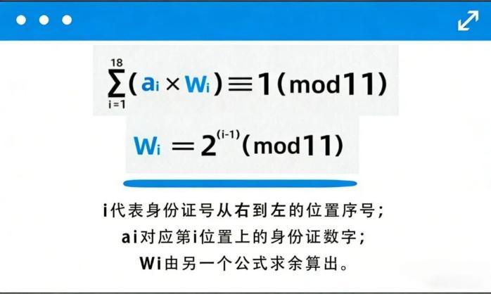 “校验码”是通过身份证前17位数字推算出来的。这套算法采用的是MOD 11-2(取模11)国家标准算法,通过加权求和、取余换算后,校验码字符值会在0到10之间。