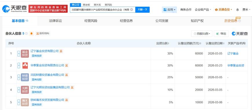正文 华泰证券等在沈阳成立新兴产业股权投资基金 出资额20亿 三木 V管理员 /前天 /0 评论 /2 阅读 0402 文章最后更新时间2026年04月02日,若文章内容或图片失效,请留言反馈! 天眼查显示,近日,沈阳都市圈华泰新兴产业股权投资基金合伙企业(有限合伙)成立,执行事务合伙人为华泰紫金投资有限责任公司,出资额20亿人民币,经营范围为以私募基金从事股权投资、投资管理、资产管理等活动。合伙人信息显示,该基金由辽宁基金投资有限公司、华泰证券(601688)旗下华泰紫金投资有限责任公司、沈阳财盛投资基金有限公司等共同出资。 关键词阅读: