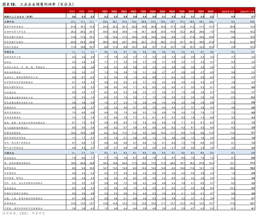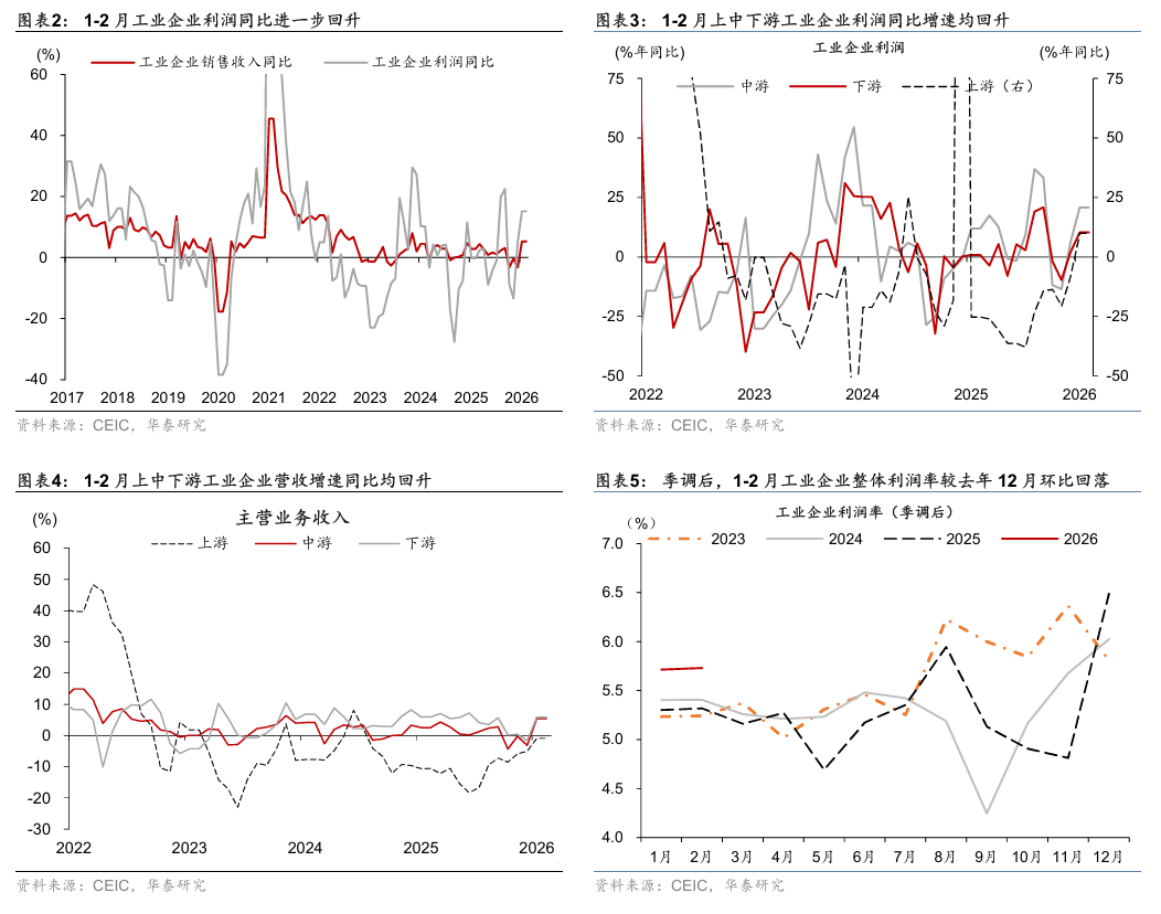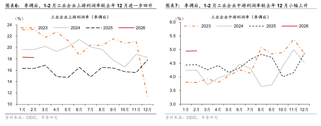 2026年1-2月工业企业利润率较去年四季度的5.4%回落至4.9%,而季调后利润率较去年四季度的5.2%上升至5.7%。 拆分看,1-2月中游工业企业利润率快速回落,而上、下游工业企业利润率整体上行,且行业间分化趋势延续——1-2月上游工企利润率较去年12月的8.4%上升至19.5%,其中油气/黑色/有色/水泥采选利润率分别较去年12月的-18.8%/5%/21%/2.9%回升49.1/5.5/18.4/12.5个百分点,对上游制造业利润率形成提振,而煤炭采选利润率较去年12月回落7.6个百分点至13.3%。中游行业工企利润率较去年12月的5.3%回落至3.7%,其中仪器仪表/专用设备/水泥制品利润率较去年12月回落6/4.9/4.8个百分点。下游行业工企利润率较去年12月略上升0.1个百分点至5.8%,其中烟草制品/酒茶饮料/食品制造利润率较去年12月上行31.7/5.2/1.9个百分点,而家具制造利润率较去年12月回落12个百分点,中下游利润率总体仍偏弱、内需回暖的基础仍待进一步夯实。