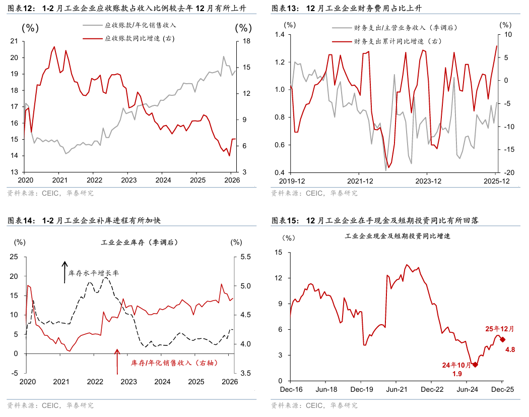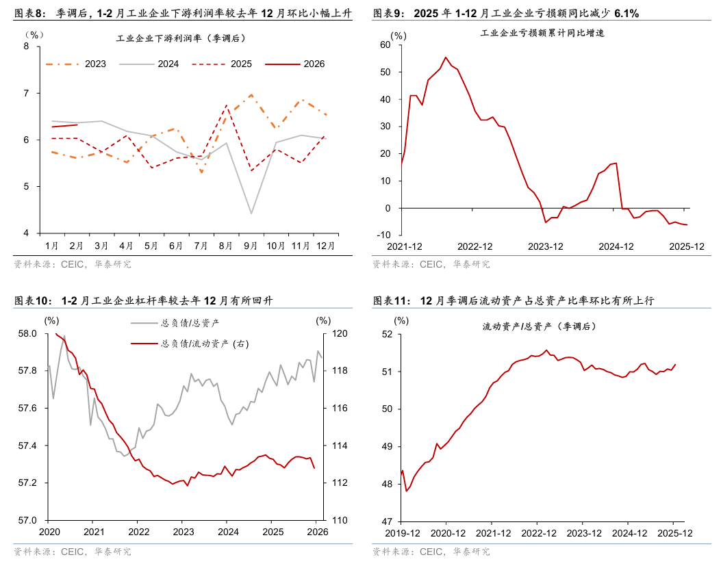 2025年全年工业企业亏损额同比回落,12月现金流同比增长亦有所放缓 。 具体看,2025年全年亏损金额较1-11月的累计同比-5.8%回落至-6.1%,12月工业企业现金流同比增速较11月的5.0%进一步放缓至4.8%、或由于年末用于偿还企业拖欠账款的政府债发行进入尾声。2025年全年财务费用同比增速较1-11月的3.9%进一步上行至7.5%,12月财务费用占主营业务收入比例亦有所增长;此外,12月季调后的流动资产比例较11月的51.04%边际上行至51.19%(2026年1-2月工业企业财务费用、流动资产和亏损额数据尚未更新)。