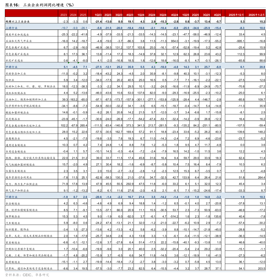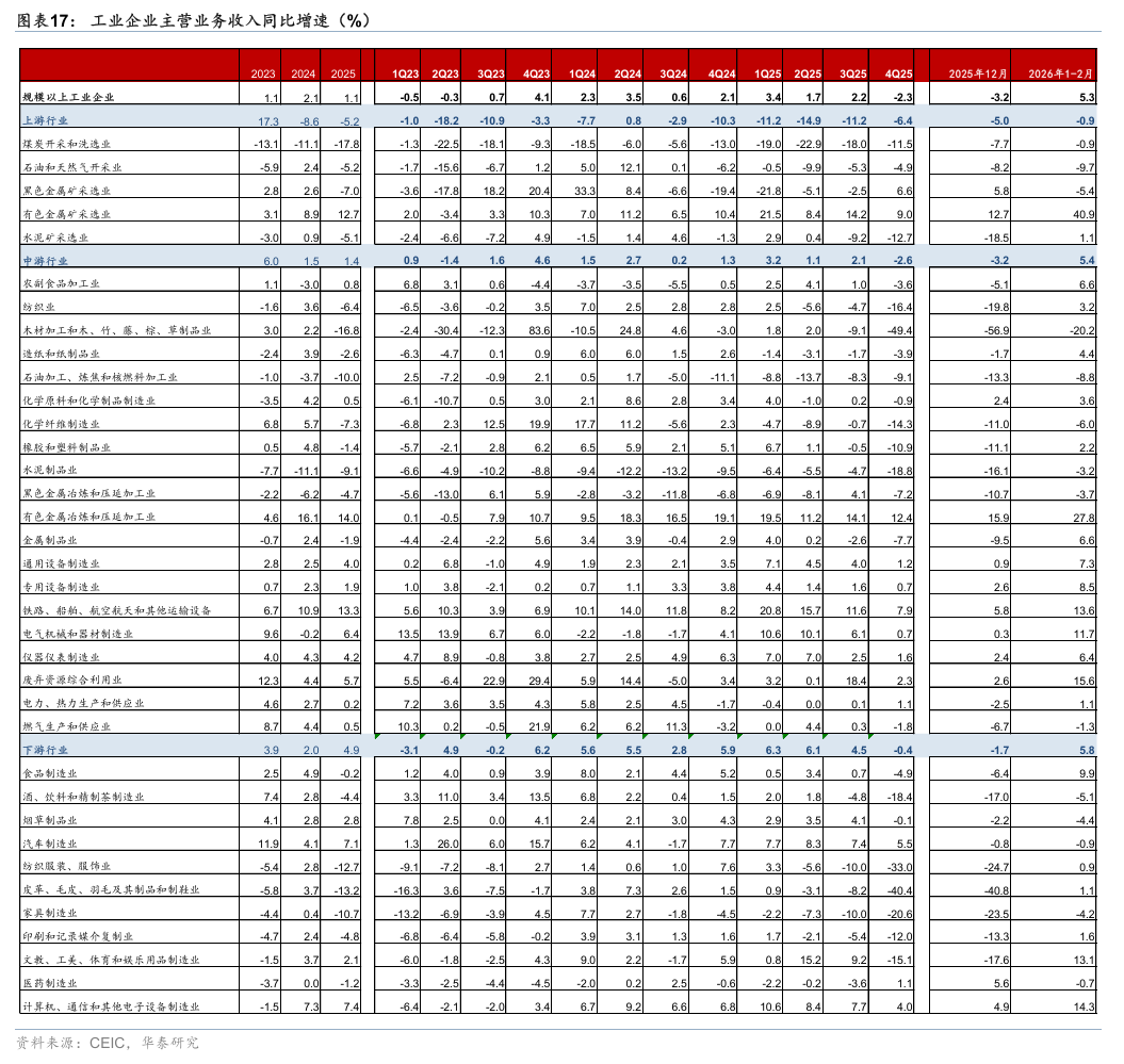 下游制造业利润1-2月同比增速从2025年4季度的-3.2%回升至10.3%,主要受到全球AI需求持续增长拉动,但如果剔除计算机通信,整体盈利增速从去年四季度的2.6%走弱至-13.3%,或表明部分受到原材料涨价的成本端冲击。 1-2月营收同比增速较去年4季度-0.4%回升至5.8%,季调后的利润率从去年4季度的5.8%回升至6.3%。分行业看,1-2月计算机、通信和其他电子设备制造业利润增速从4季度的37.1%大幅回升至203.5%,对利润增速的贡献约7.0个百分点,与全球AI需求增长和出口产品结构优化有关。1-2月汽车制造业利润降幅从4季度的7.2%走阔至30.2%,可能是由于有色价格上行压缩行业利润,叠加量价双弱的行业情况。此外,1-2月纺织服装利润同比增速从4季度的-45.0%改善至-5.2%;家具制造业利润同比增速从4季度的1%转负至-40.0%。