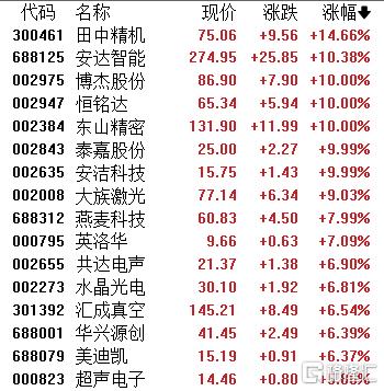 截至发稿,田中精机大涨超14%,博杰股份、恒铭达、东山精密、泰嘉股份、安洁科技强势封板,大族激光、共达电声、燕麦科技、超声电子等个股紧随其后,表现活跃。