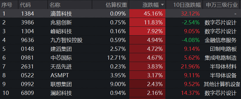 板块内,数字芯片、半导体成份股涨幅居前。有“企业AI第一股”之称的滴普科技暴涨45%,兆易创新涨超11%,峰岹科技涨超7%,九方智投控股、建滔集团、中芯国际纷纷大涨逾4%。