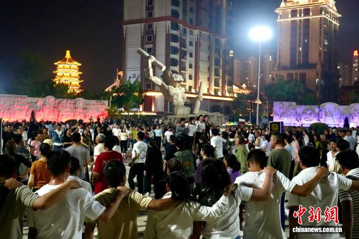 游客市民在云南省临沧市佤文化广场上打歌。 罗婕 摄