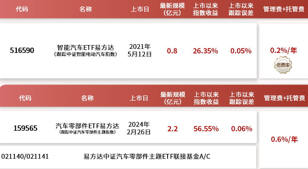 盘点易方达基金旗下汽车产业系列 ETF ,详见下图所示: