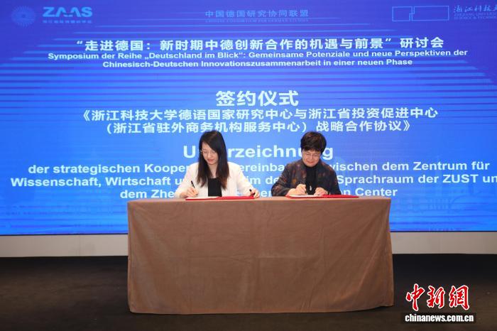 4月18日,《浙江科技大学德语国家研究中心与浙江省投资促进中心(浙江省驻外商务机构服务中心)战略合作协议》签约仪式现场。 (浙江科技大学德语国家研究中心供图)