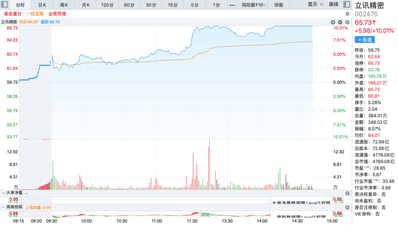 立讯精密今日强势高开,随后整体呈现震荡上行的走势,午后10CM涨停,股价报65.73元/股,总市值为4789.08亿元,截至发稿未打开涨停板。