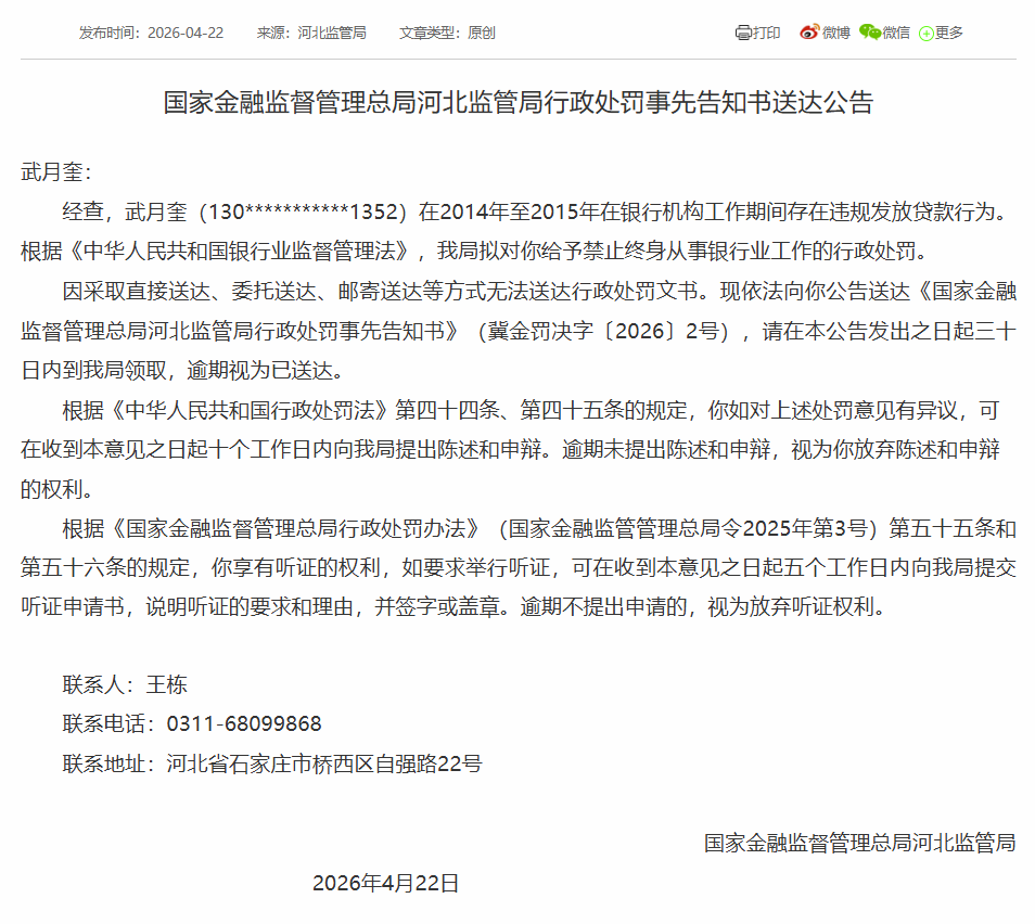 公告显示,武月奎在2014年至2015年于银行机构工作期间,存在违规发放贷款的行为,依据《中华人民共和国银行业监督管理法》相关规定,监管部门拟对其作出禁止终身从事银行业工作的行政处罚,并公告送达《行政处罚事先告知书》(冀金罚决字〔2026〕2号)。